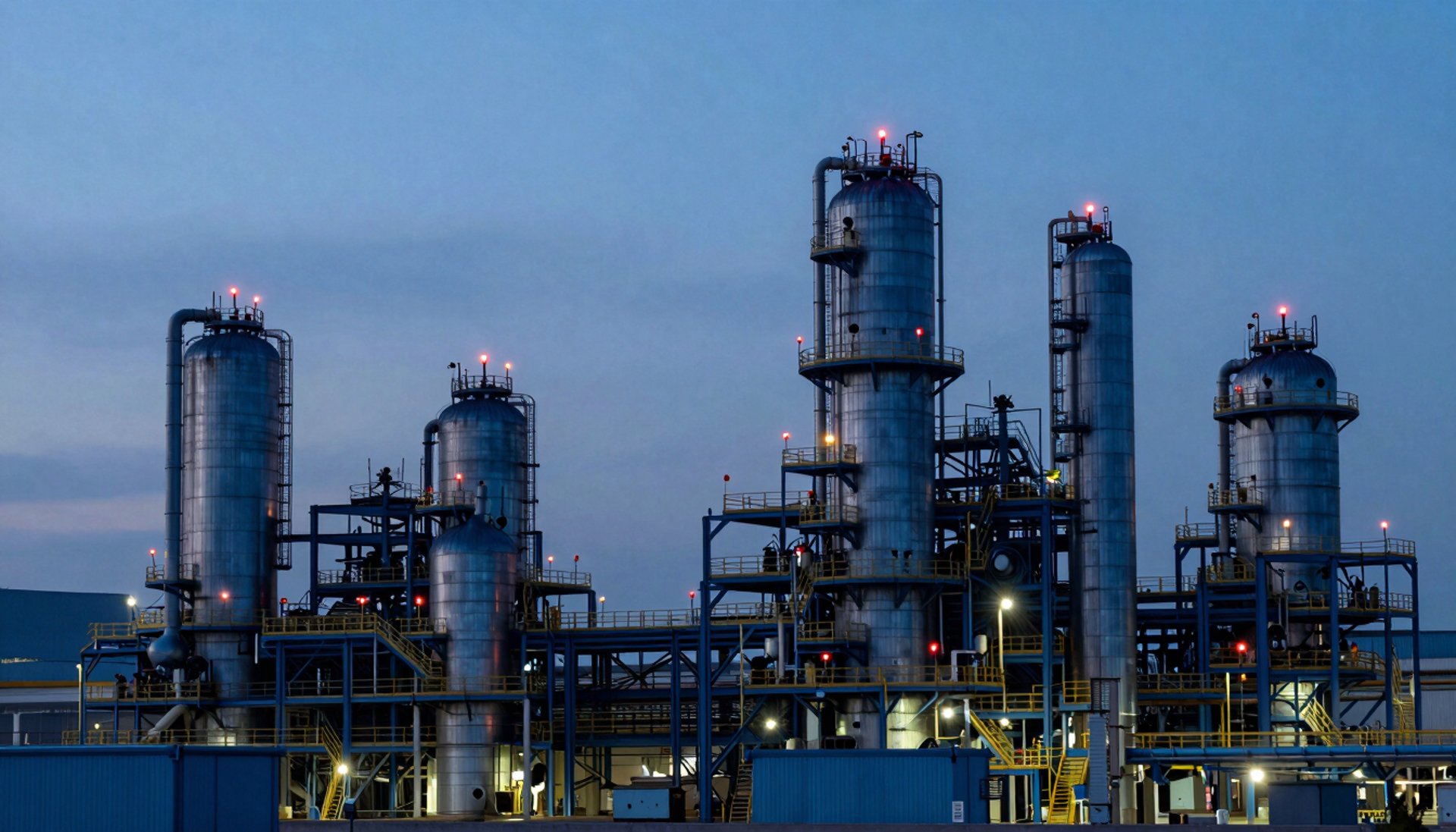 A wide-angle technical photograph of a large-scale commercial construction site at dusk. The structural steel frame is highlighted by warm site lights against a dark royal blue sky. Sharp focus and professional architectural photography style.